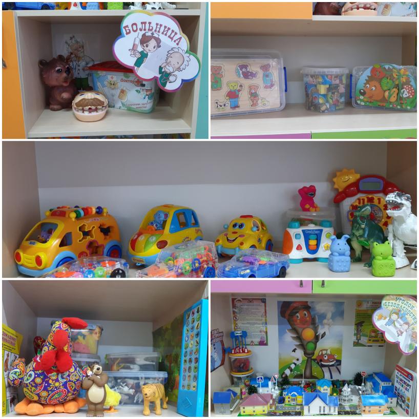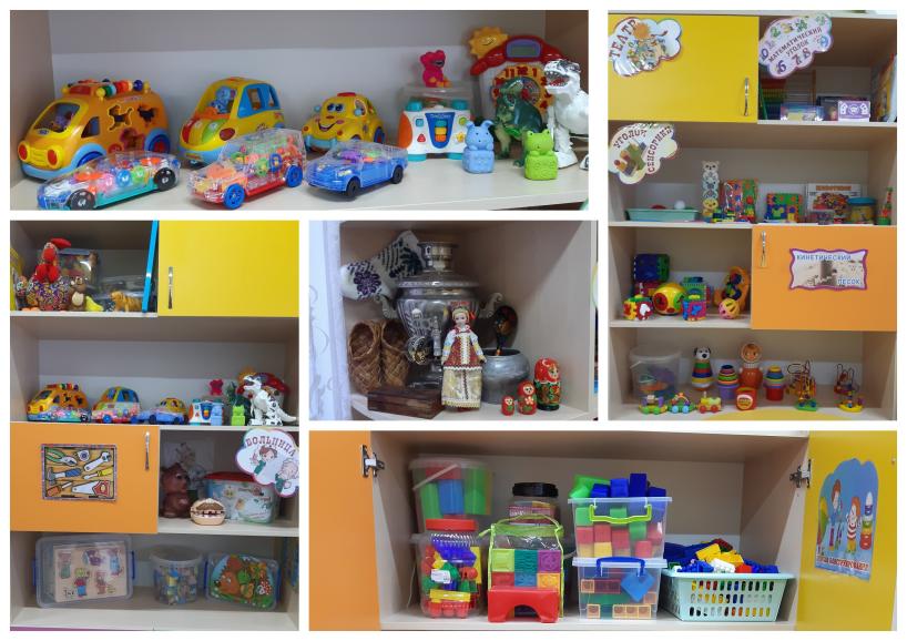 Игровая комната: столы детские - 3, стулья детские -15, шкаф многосекционный для игрового материала-1,мольберт-1, игровая мебель Кухня», уголок природы-1, театральный уголок (напольная 3-х ярусная полка, ширма)-1, книжный уголок-1, национальный уголок ( навесная полка)-1, спортивный уголок-1, уголок для самостоятельной художественной деятельности детей -1, игровые и методические материалы,